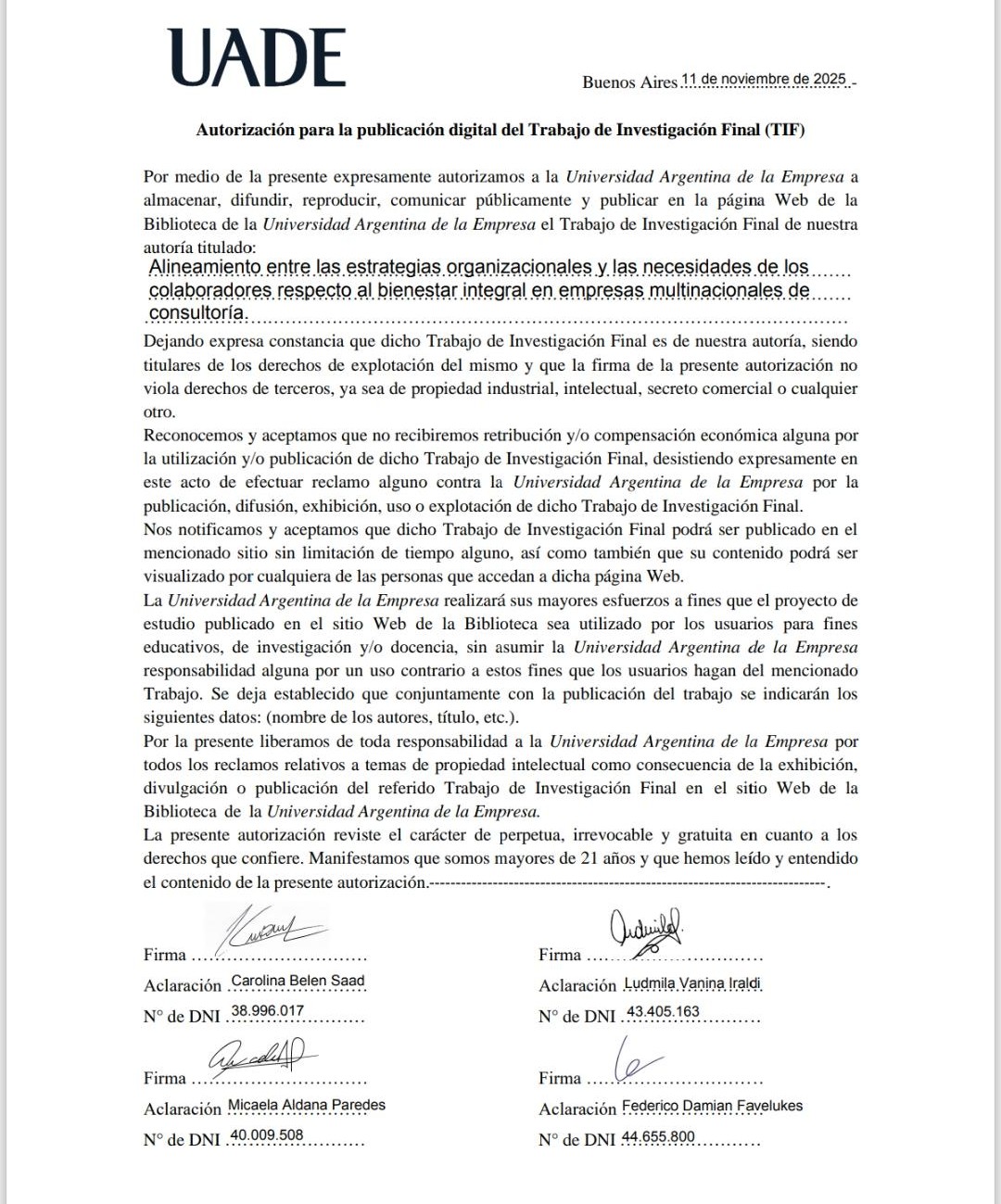 Alineamiento entre las estrategias organizacionales y las necesidades de los colaboradores respecto al bienestar integral en empresas multinacionales de consultoría., (2026-02-20)